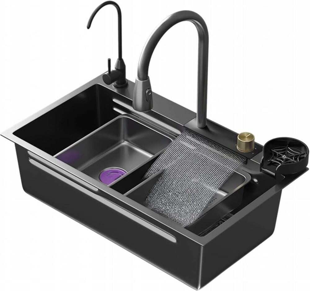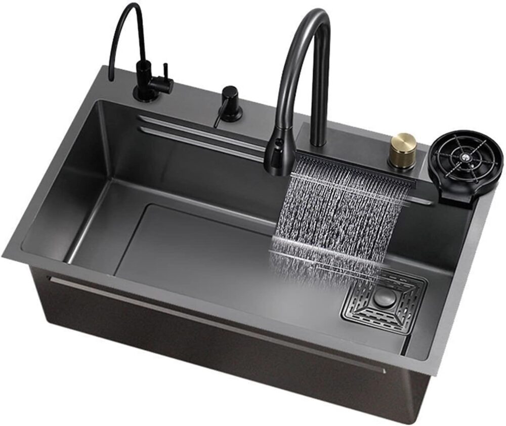(32x18x9 Inches)antiscratch Premium Stainless Steel Single Bowl Kitchen Sink Black Kitchen Sink with Pull-Out Mixer Faucet, RO Tap & Integrated Waterfall & Automatic Cup Washer Waterfall kitchen sink