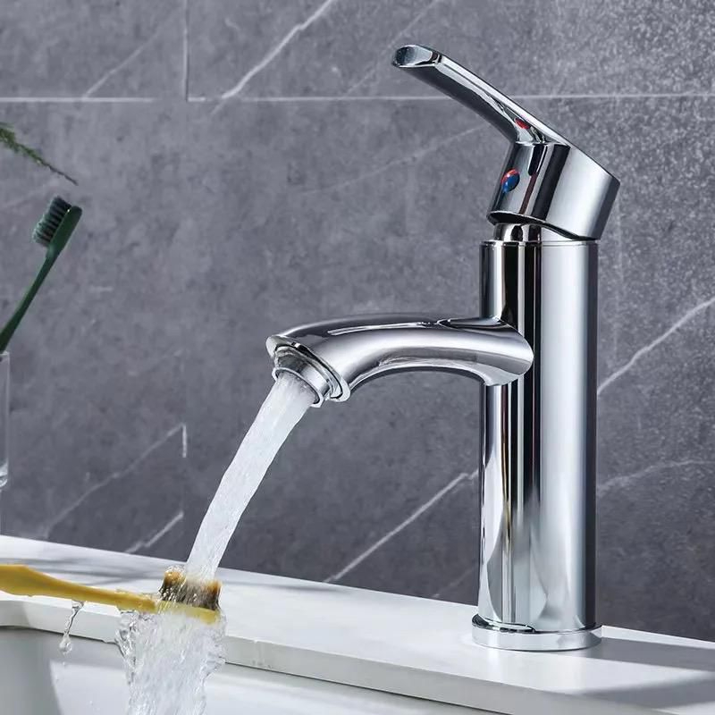 A basin mixer combines hot and cold water into a single stream with a single control lever.