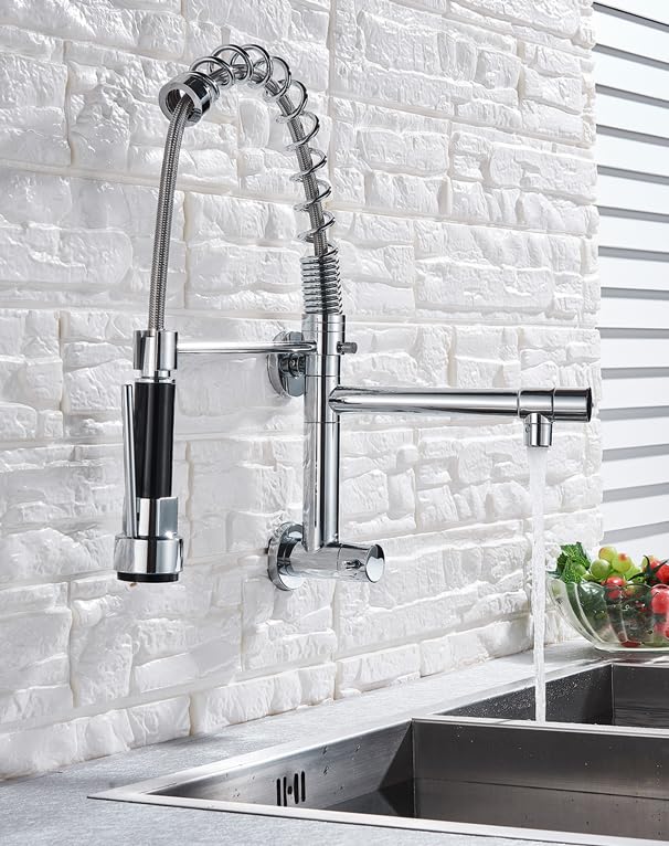 Brass Wall Mount Sink Tap with 2 Spouts, Kitchen Sink Tap Pull-Out Sprayer Faucet Single Lever Kitchen Faucet-Kitchen Water Tap (Crome)