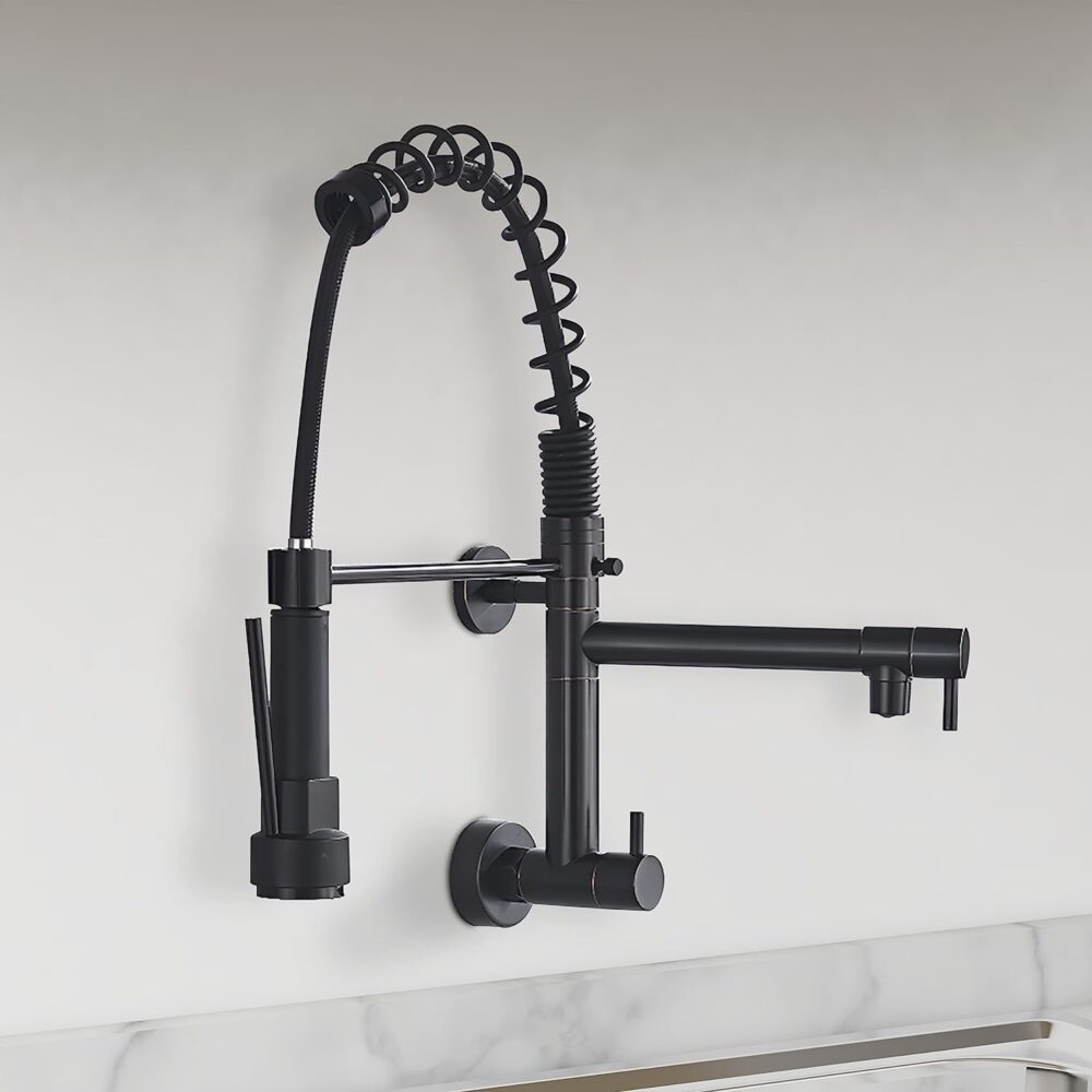 Designer Sink Faucet Brass Wall Mount Sink Tap with 2 Spout/Double Handle High Arc (360 Degree) Spring Pull Out Tap for Kitchen Sink (Black)