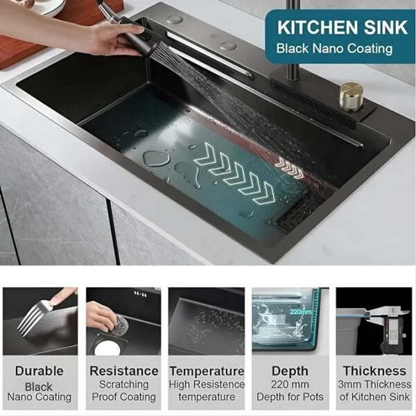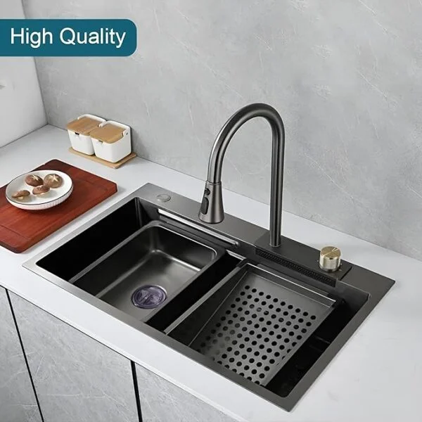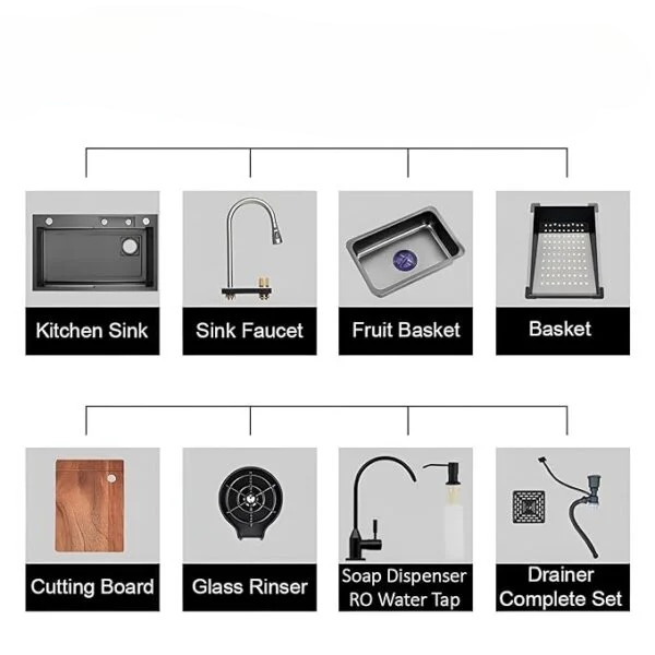 Complete Accessories – WATERFALL KITCHEN SINK || SINK COUPLING || PVC WASTE PIPE | BASKET || TRAY | PULL OUT FAUCET || SOAP DISPENSER || CHOPPER || GLASS RINSER