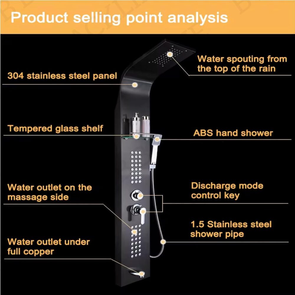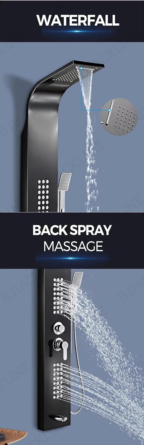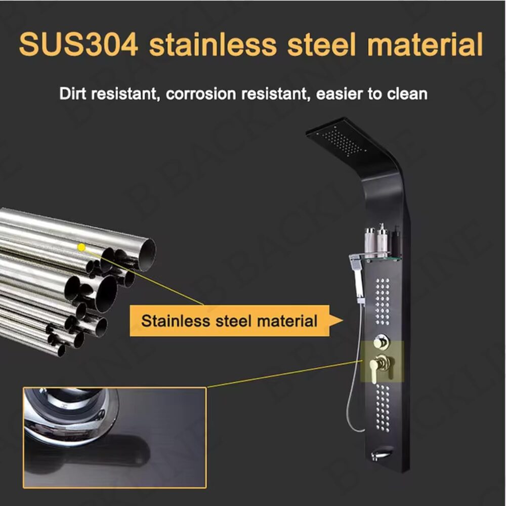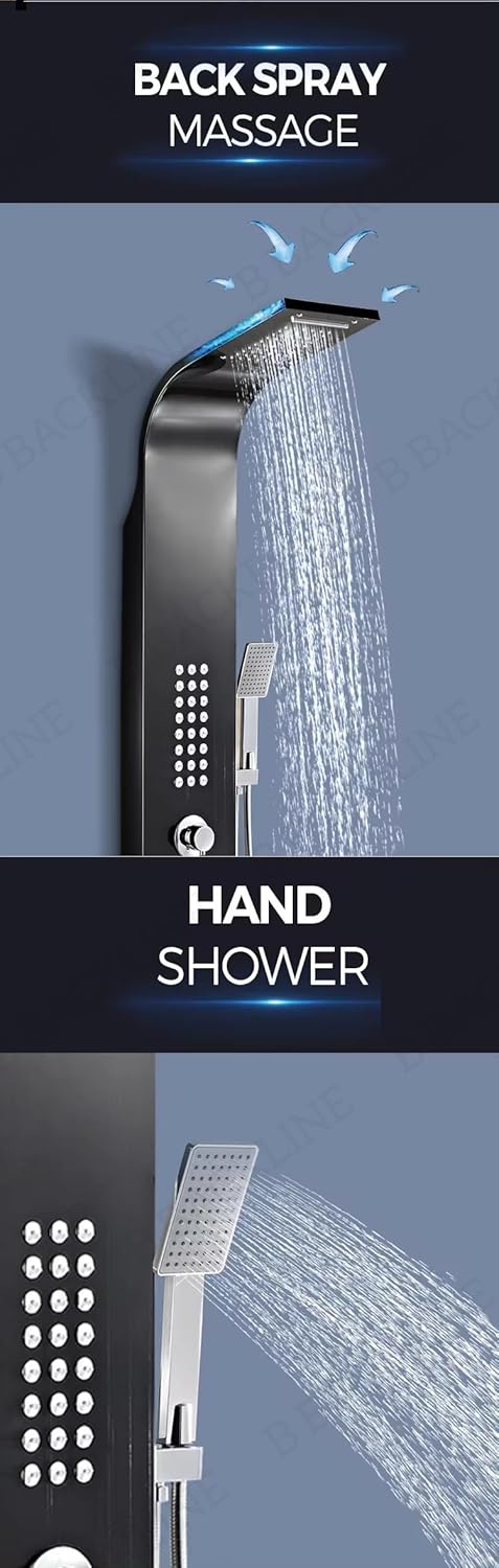 Stainless Steel 304 Grade Shower Panel 6 in 1 Shower With LED Rainfall Shower | Body Massage | Overhead Shower | Body Jet | Handheld Shower | Shower Panel Mirror Finish (Black)