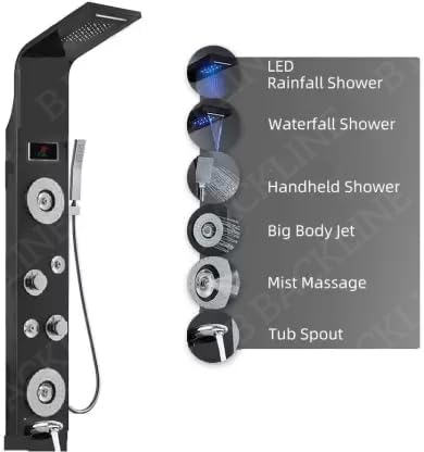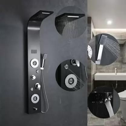 Stainless Steel 304 Grade Shower Panel 6 in 1 Shower With LED Rainfall Shower | Body Massage | Overhead Shower | Body Jet | Handheld Shower | Shower Panel Mirror Finish (Black)