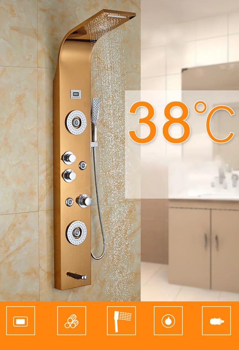 Stainless Steel 304 Shower Panel 6 in 1 System With Temperature DIGITAL LED Shower Panel | Body Massage | Overhead Shower Dual Flow | Body Jet | Handheld Shower Spray | Shower Panel (Gold)