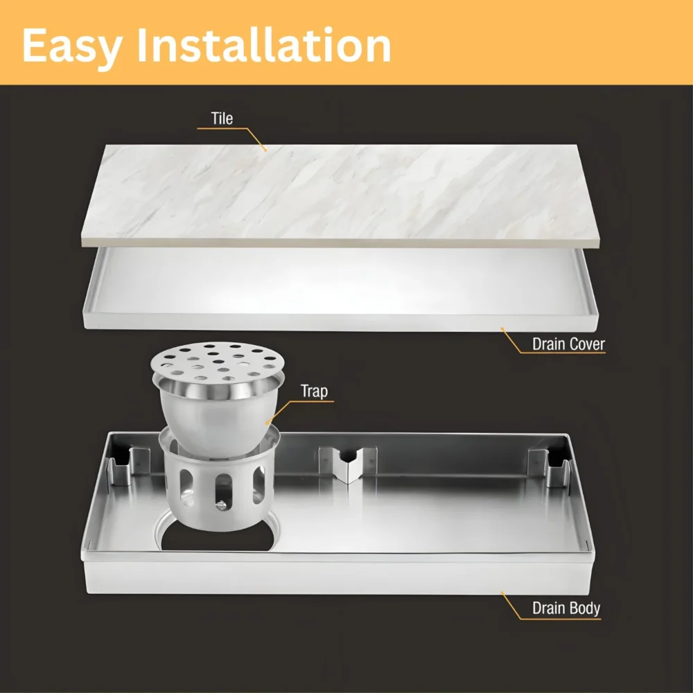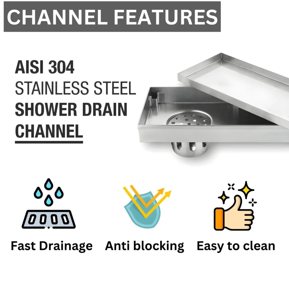 Tile Insert Shower Drain Channel 304 grade | 16 x 4 Inches Waste Water Floor Drain | 304 Stainless Steel Invisible |Cockroach Trap and Side Hole
